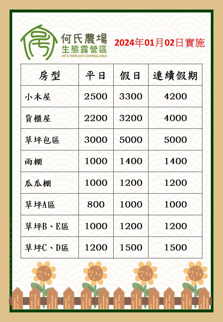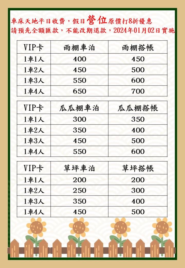 1.各區價格調整如下表(2024/01/02起營位價格調整,原先在2024/01/01預訂並且匯款成功者,以原先價格收費,不做調整。)